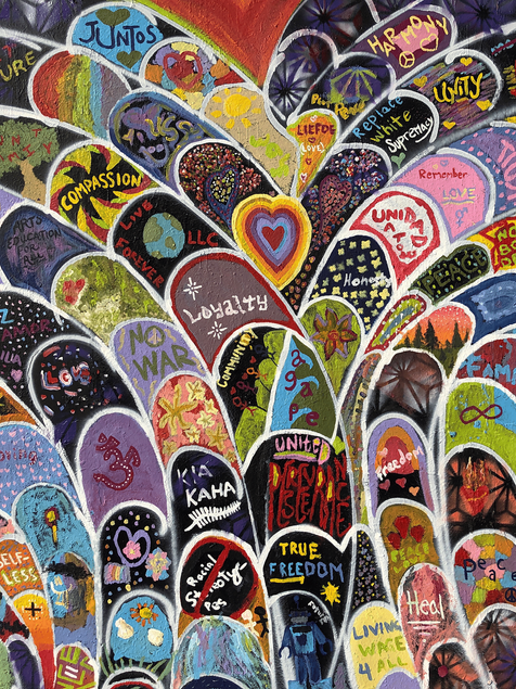 Paintemonium is wearable art designed and created by the artist with the participants of each mural. Based on the artworks of The EverybodyCanPaint collaborative public art project, it is a mobile art experience that brings inclusive, participatory art to various communities and events. No prior art experience is necessary. The collaborative process is open to all with artist Richard Art Felix leading the way. He designs each mural format, facilitates the creative painting/writing experience, and guides participants through the creative process. After everyone has contributed their unique artistic expression, Felix "finishes" or finesses the artwork, ensuring that the final piece meets his artistic standards while maintaining the collective spirit of the project.